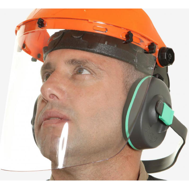 Kit compuesto por protector auditivo y facial burbuja con soporte.