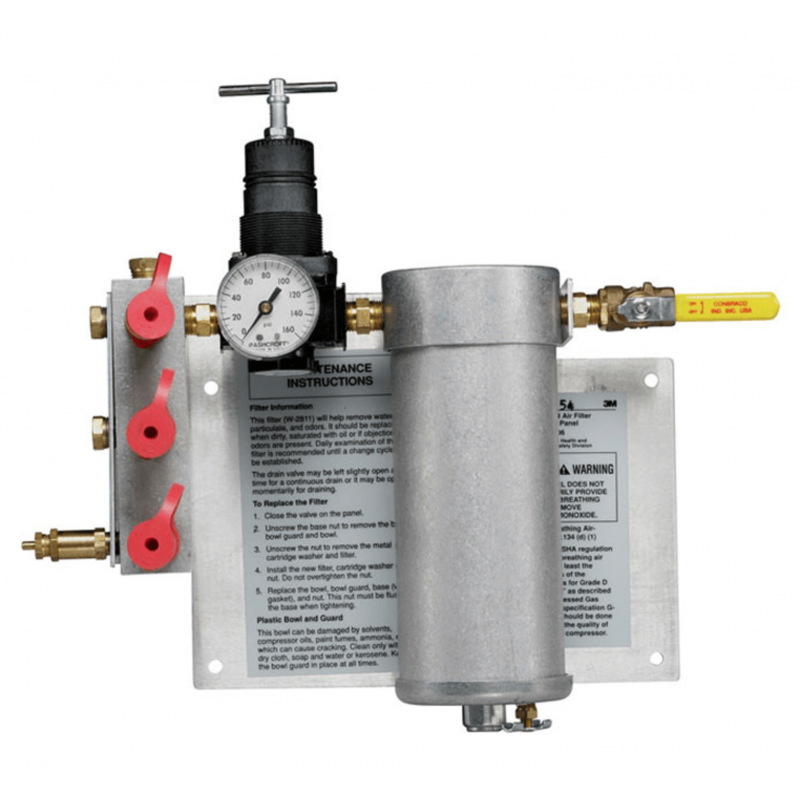 El filtro para aire comprimido y panel regulador W-2806 de 3M es portátil, filtra, seca y regula el aire de planta normal. Tiene una capacidad máxima de 50cm a 105psi. No elimina el monóxido de carbono (CO) de la fuente de aire comprimido. Estos paneles filtran y regulan el aire que ingresa en los respiradores con suministro de aire de 3M. Según qué panel se haya seleccionado, estas unidades pueden monitorear y/o filtrar Monóxido de Carbono (CO) o simplemente regular y filtrar el aire suministrado al respirador.